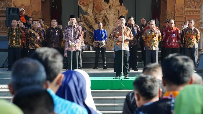 Bupati dan Wakil Bupati yang didampingi istri terlihat mengenakan baju batik. Begitupun Sekda Tontro Pahlawanto, seluruh pimpinan OPD dan ratusan ASN yang mengikuti apel juga mengenakan baju serupa.