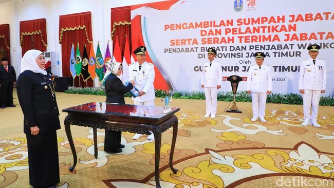 Gubernur Jawa Timur Khofifah Indar Parawansa resmi melantik dan mengambil sumpah jabatan Penjabat (Pj) bupati dan wali kota bagi kabupaten/kota untuk sesi kedua di Gedung Negara Grahadi, Surabaya, Minggu (24/9) sore.