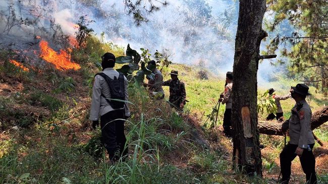Kebakaran hutan di Gunung Lawu, Ngawi meluas ke wilayah Magetan. TNI-Polri bersama BPBD siaga melakukan pemadaman dengan membuat ilaran api pembersihan semak-semak.
