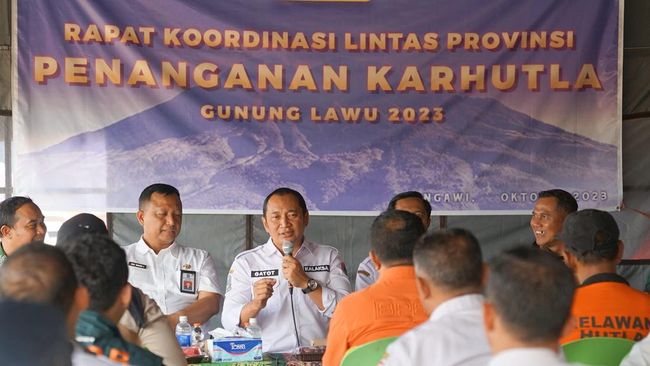 Kebakaran hutan dan lahan (Karhutla) Gunung Lawu kini semakin meluas hingga ke Karanganyar, Jawa Tengah. BPBD Jatim menggelar rapat koordinasi lintas provinsi di Posko Penanganan Darurat Karhutla di Lapangan Aji Negoro, Mbasri, Desa Sidorejo, Kendal, Ngawi.