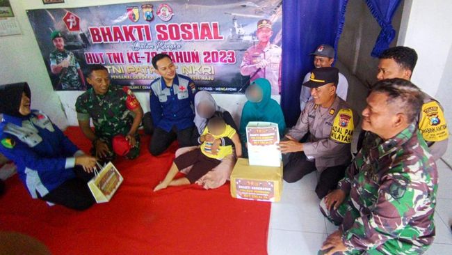 Polres dan Kodim 0814 Jombang menggelar pengobatan gratis dan penyaluran sembako. Pengobatan gratis merayakan HUT TNI ke-78 juga menyasar penderita kanker usus hingga bocah lumpuh otak (Cerebral Palsy).