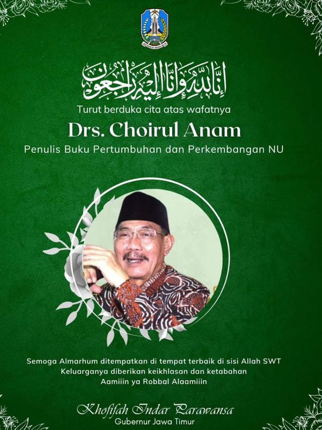 Telah dipanggil keharibaan Allah SWT Bapak H. Choirul Anam. Sosok penggerak GP. Ansor Jawa Timur, jurnalis senior serta penulis buku Pertumbuhan dan Perkembangan NU. Buku paling lengkap menuliskan perjalanan NU di Indonesia," tulis Gubernur Khofifah di instagramnya @khofifah.ip yang dilihat detikJatim, Senin (9/10/2023).