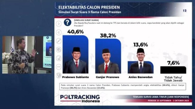 Dalam survei Poltracking di Jatim, elektabilitas Prabowo di angka 40,6% disusul Ganjar di angka 38,2%. Sedangkan Anies Baswedan berada di posisi ketiga dengan angka 13,6%.