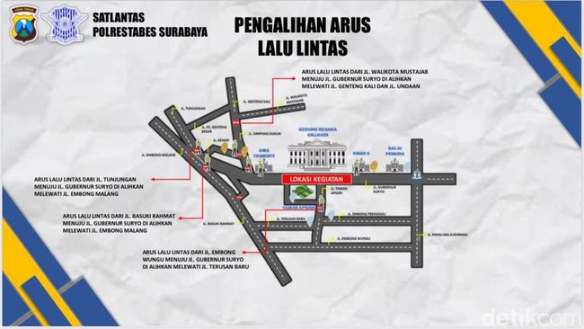 Kasat Lantas Polrestabes Surabaya AKBP Arif Fazlurrahman mengatakan, inti kegiatan akan dipusatkan di Gedung Negara Grahadi Surabaya. Sebelum kegiatan dimulai, pihaknya bakal menyiapkan skema pengaturan lalin di Jalan Gubernur Suryo Surabaya dan sekitarnya.