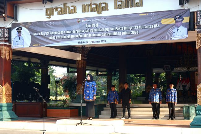 Pemkab Mojokerto menggelar ikrar bersama dan menandatangani pakta integritas netralitas Aparatur Sipil Negara (ASN) dalam Pemilu dan Pilkada serentak tahun 2024. Pada momen ini, Bupati Ikfina Fahmawati mengingatkan 8 bentuk pelanggaran netralitas yang wajib dihindari para ASN.