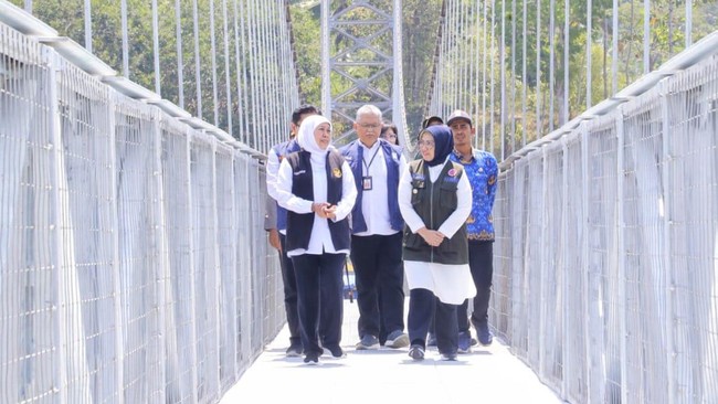 "Alhamdulillah siang ini kita meresmikan jembatan gantung Kaliregoyo Tanggul Sungai Glidik dan Tanggul Sungai Mujur Lumajang. Bismillah semoga bisa menjadi akses yang bisa membangkitkan ekonomi, sosial, dan pendidikan masyarakat di Kabupaten Lumajang," ujar Khofifah, Selasa (17/10/2023).