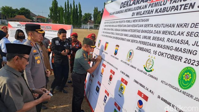 Polres Jombang menggelar deklarasi Pemilu Damai 2024 untuk menjaga kamtibmas. Deklarasi ini juga melibatkan sejumlah paguyuban silat yang ada di Kota Santri.