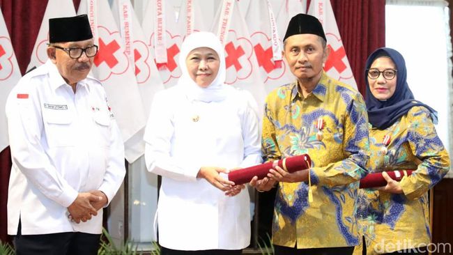 Gubernur Jawa Timur Khofifah Indar Parawansa menyerahkan piagam penghargaan dan menyematkan Satya Lencana kepada sukarelawan donor darah PMI yang telah mendonorkan darahnya sebanyak 75 kali. Total ada 525 orang yang menerima penghargaan dan lencana dari Khofifah.