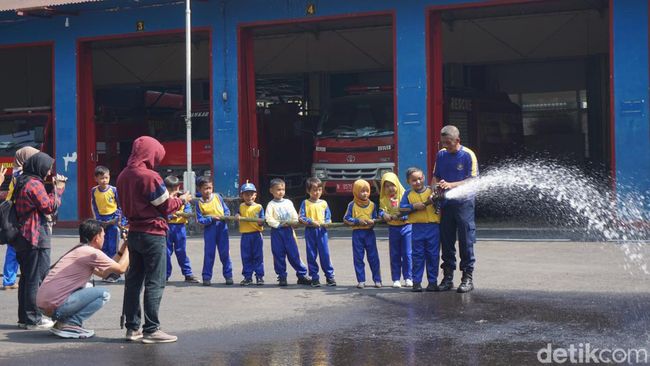 Belasan siswa-siswi Taman Kanak-Kanak (TK) Tunas Bangsa di Kota Malang belajar pemadaman kebakaran. Pembelajaran itu digelar di markas UPT PMK Pemkot Malang.