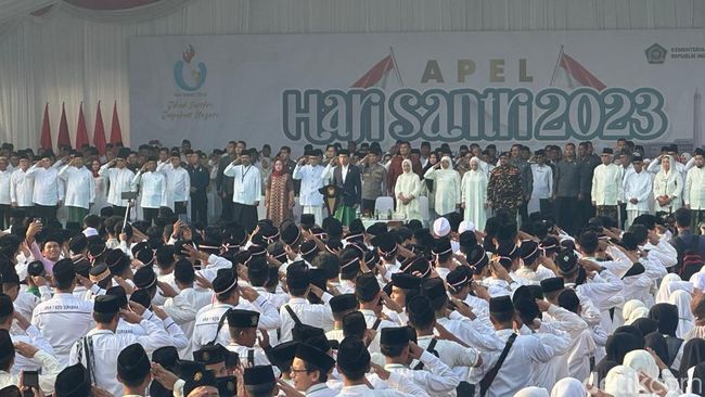 "Yang saya hormati, saya cintai para santri, dan santriwati hadirin dan undangan berbahagia. Puji dan syukur kehadirat Allah SWT atas karunia kita bisa berkumpul, silaturahmi di Peringatan Hari Santri 2023," tambah Jokowi.