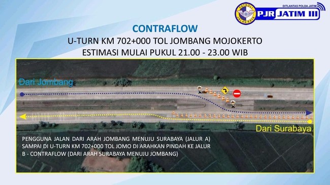 "Pengguna jalan dari arah Jombang yang akan melintas KM 702 diarahkan contraflow pindah ke jalur B, sampai dengan Km 706 pengguna jalan baru kembali sesuai jalur A," terangnya.