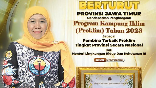 "Terima kasih atas seluruh upaya dan kerja kerasnya dari seluruh elemen masyarakat untuk mewujudkan proklim di wilayah masing-masing," kata Khofifah, Rabu (25/10/2023).