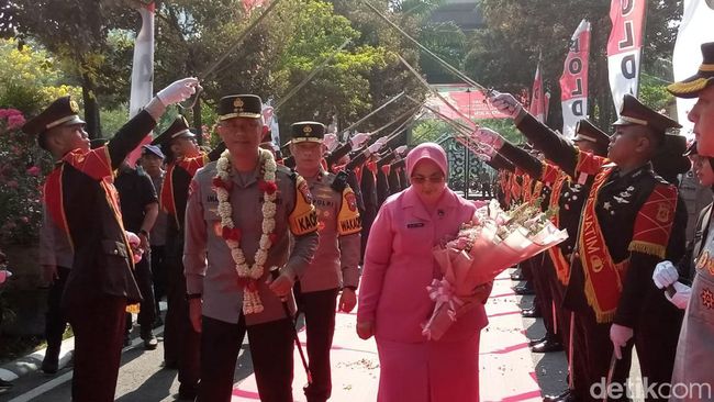 Pantauan detikJatim di lokasi, Imam dan istri berjalan di karpet merah dengan dipayungi pedang pora. Sejumlah pejabat utama Polda Jatim kemudian menyalami dan mengalungkan rangkaian bunga ke Imam.
