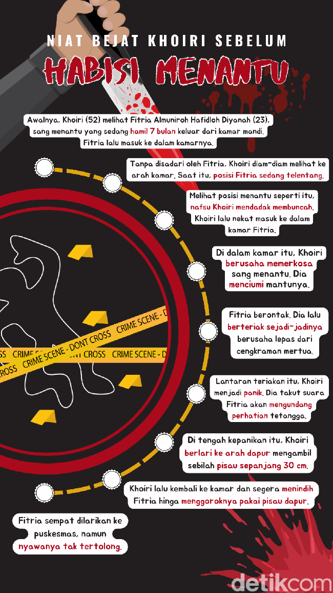 Surabaya - Nyawa Fitria Almuniroh Hafidloh Diyanah (23) melayang di tangan mertuanya, Khoiri (52). Sebelum membunuh, Khoiri ternyata berniat memerkosa menantunya tersebut. Simak infografis awal mula niat bejat Khoiri berujung membunuh Fitria secara sadis.