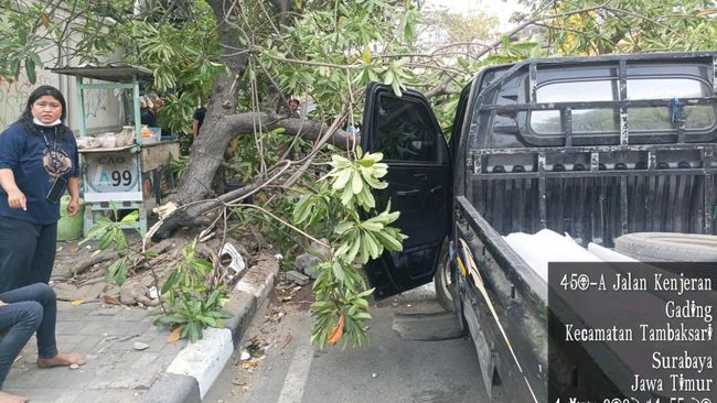 Sebuah pikap menabrak pohon di Jalan Kenjeran Surabaya. Pohon itu pun tumbang dan menimpa mobil.
