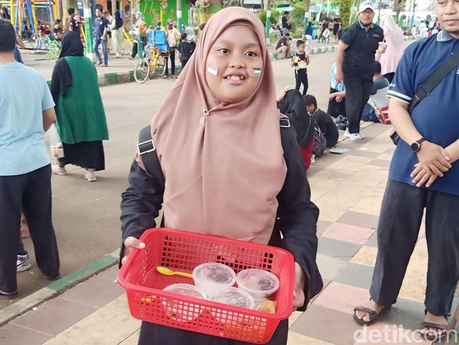 Saat menjajakan dagangannya, segenap murid SD ini melengkapi diri dengan aksesoris bendera Palestina dan bendera Indonesia, yang ditempel di pipi. Pantauan detikJatim, usai mendapat arahan dari pihak sekolah, siswa siswi itu langsung menyebar di alun-alun.