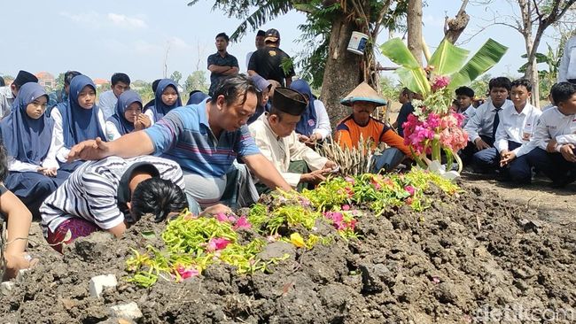 Pantauan detikJatim, teman-teman sekolah, rekan-rekan sesama pemain bola, tetangga, hingga kerabat almarhum turut mengiringi pemakaman tegar.