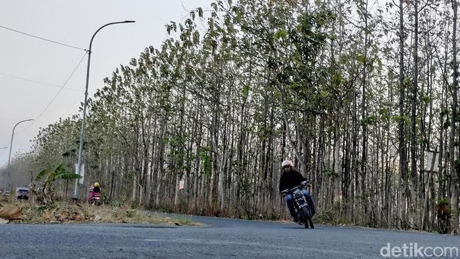 Di hutan itu, terlihat ribuan pohon jati yang berjajar dalam kondisigundul tanpa daun. Tanahnya pun gersang.
