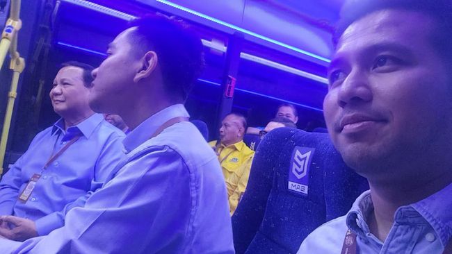 Dari foto yang tersebar, Prabowo duduk satu kursi dengan Putranya Didit di bus listrik. Sedangkan Gibran tampak semringah berada satu kursi ditemani Emil Dardak.