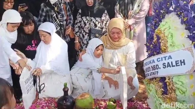 Dari pantauan detikJatim, usai pemakaman bacaan doa dari kedua putri almarhum hingga tangisan sang istri tak bisa dibendung usai tabur bunga.