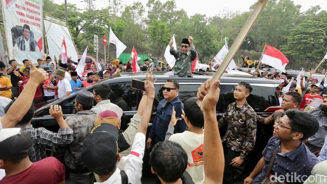 Mahfud yang berada di mobilnya, menyapa para pendukungnya yang mengacungkan salam tiga jari. Mahfud pun membalasnya dengan mengacungkan jarinya dan meneriakkan salam demokrasi.