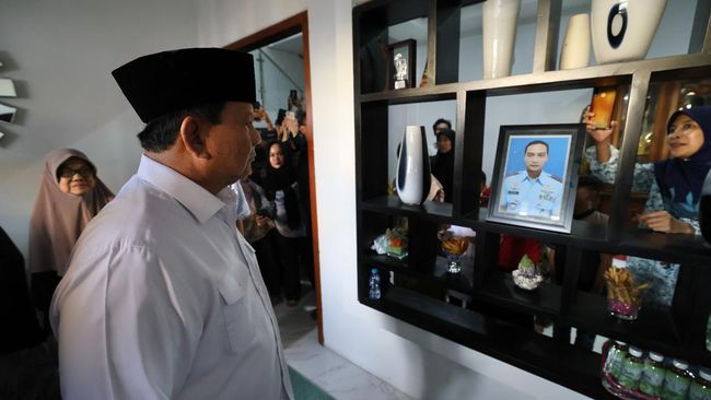 Prabowo terlihat mengunjungi kediaman Kolonel Anumerta Sandhra Gunawan yang berada di Jalan Komud Abd Saleh, Kecamatan Pakis, Kabupaten Malang, Sabtu (18/11/2023), sekitar pukul 15.45 WIB.