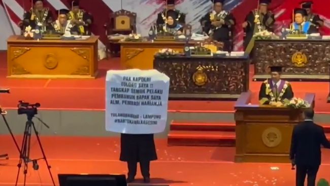 Wisudawan Universitas Negeri Malang (UM) membentangkan spanduk berisi permintaan tolong kepada Kapolri, agar pembunuh ayahnya ditangkap. Begini penjelasan UM.