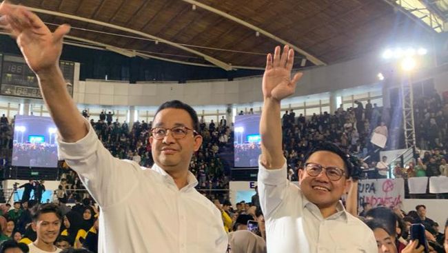 Paslon capres-cawapres nomor urut 1 Anies Baswedan-Muhaimin Iskandar (AMIN) menghadiri acara Diskusi & Diseminasi Mahasiswa Mendebat Capres-Cawapres di DBL Arena Surabaya, Rabu (22/11/2023) petang.