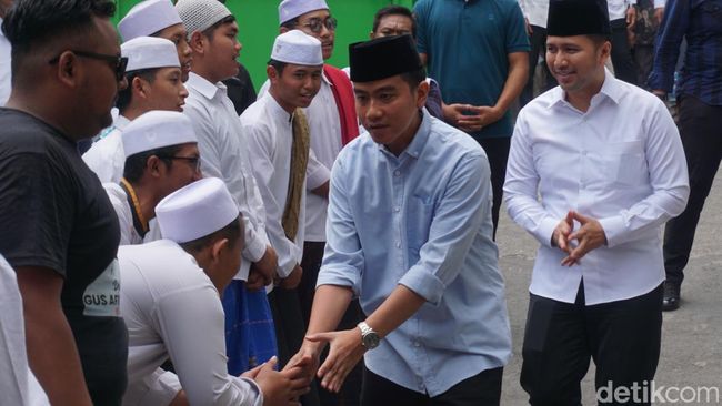 Selain disambut Kiai Asep, Gibran juga disambut Wabup Mojokerto Muhammad Al Barraa yang juga putra Kiai Asep.