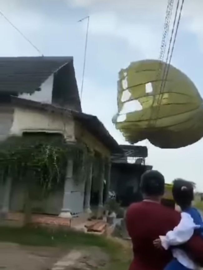 Tampak parasut yang menyangkut membuat antene patah. Sedangkan penerjun mendarat di atap rumah warga dengan posisi parasut tersangkut kabel aliran listrik yang memanjang tersambung antara rumah satu dengan lainnya. Terdengar suara genting pecah hingga sejumlah warga berlarian mendekat untuk memberi pertolongan.