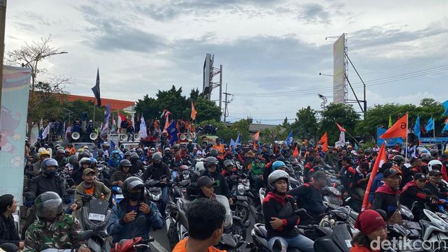 Para buruh yang semula berangkat dari Bundaran Waru dan melewati frontage Ahmad Yani, tiba-tiba berhenti di kawasan Taman Pelangi. Dari pantauan detikJatim, mereka sengaja berhenti dan duduk-duduk di tengah jalan.