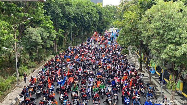 Pantauan detikJatim dari Kebun Binatang Surabaya (KBS), rombongan massa buruh yang dominan menaiki sepeda motor itu dipimpin sejumlah mobil komando. Sekitar pukul 15.27 WIB rombongan massa itu mulai melintasi jembatan penyeberangan orang (JPO) KBS ke Jalan Raya Darmo.