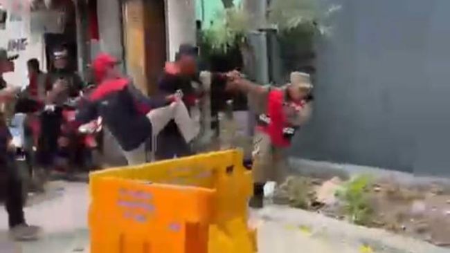 Terlihat dalam video tersebut seorang pria mengenakan kaos berwarna hitam dengan penutup kepala merah terlihat menendang seorang petugas yang memakai seragam Satpol PP.