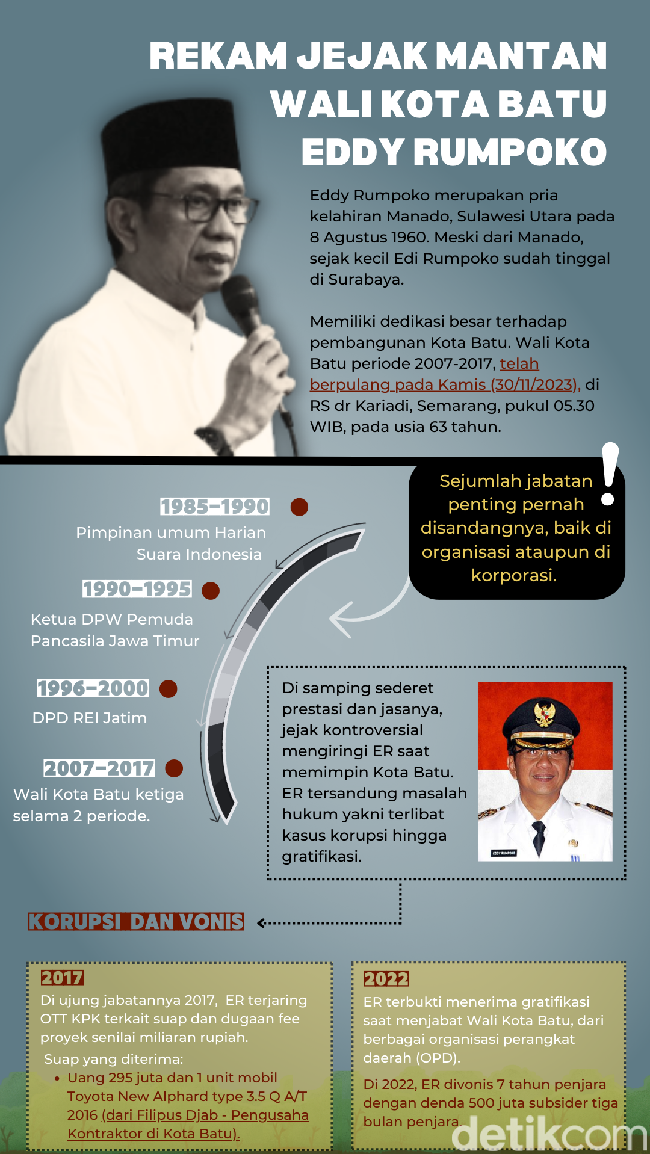 Batu - Wali Kota Batu periode 2007-2017 Eddy Rumpoko meninggal dunia di Semarang, Kamis (30/11/2023). Sepanjang kariernya sebagai wali kota, pria yang akrab disapa ER itu membawa kemajuan bagi Kota Batu, terutama di sektor pariwisata. Kendati demikian, Eddy Rumpoko pernah terjaring OTT KPK dan terjerat kasus suap dan gratifikasi. Simak infografis berikut ini.