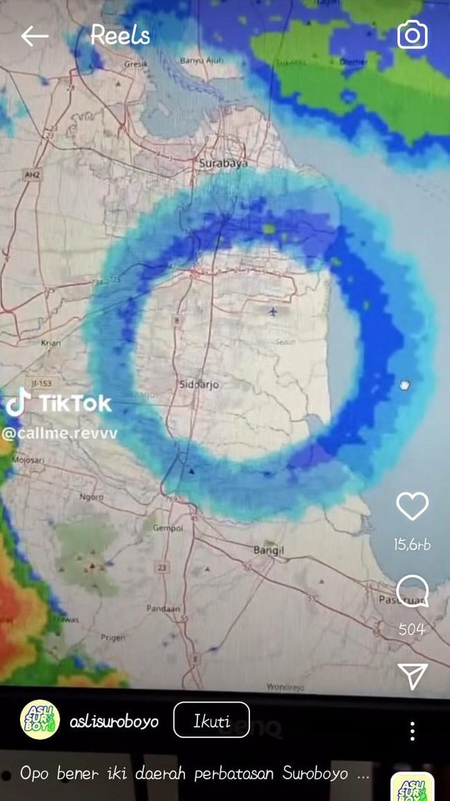 Sebuah postingan di akun Instagram @aslisuroboyo menunjukkan sebuah lingkaran biru melingkari Surabaya-Sidoarjo. Namun, tak dijelaskan secara pasti perihal fenomena tersebut.