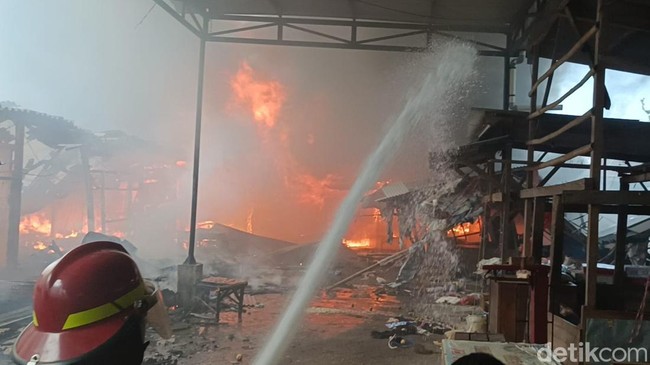 Api terlihat terus membesar dengan asap hitam membubung tinggi. Ratusan pedagang di pasar itu kalang kabut memadamkan api.