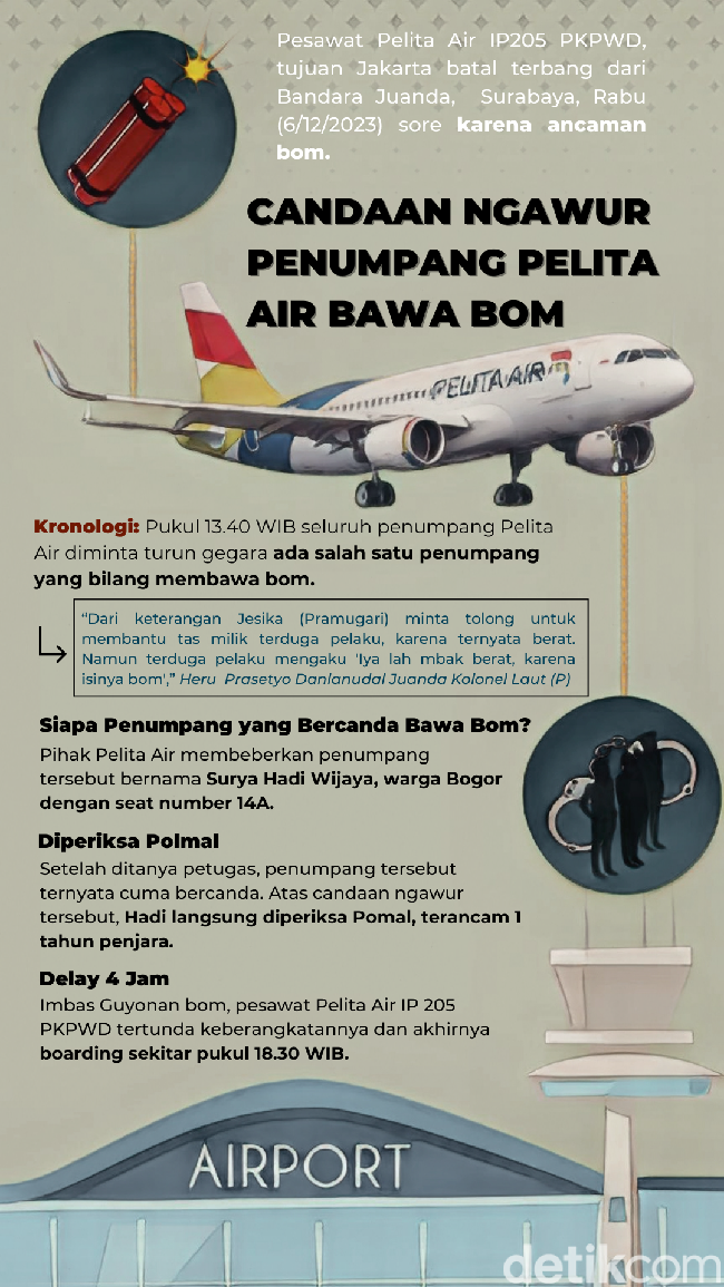 Surabaya - Surya Hadi Wijaya harus berurusan dengan hukum akibat candaan ngawurnya. Penumpang Pelita Air IP 205 itu mengatakan ke pramugari di tasnya ada bom. Simak infografis di atas.