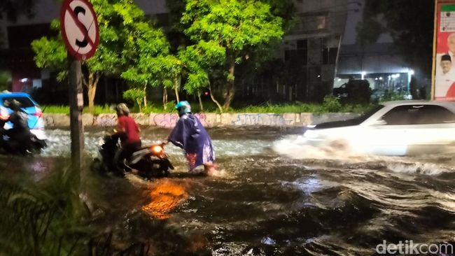 Dari pantauan detikJatim, beberapa pemotor yang nekat menerjang hujan terpaksa mendorong motornya. Sebab ketinggian air mencapai ban sepeda motor.