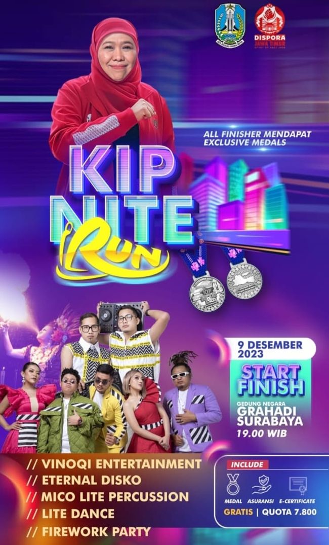 Dispora Jawa Timur (Jatim) menggelar KIP Nite Run 2023 Sabtu malam (9/12/2023) pukul 19.00 WIB. Fun run yang sedang ngetren di ibu kota ini digelar juga di Surabaya, dan banyak diikuti kawula muda.