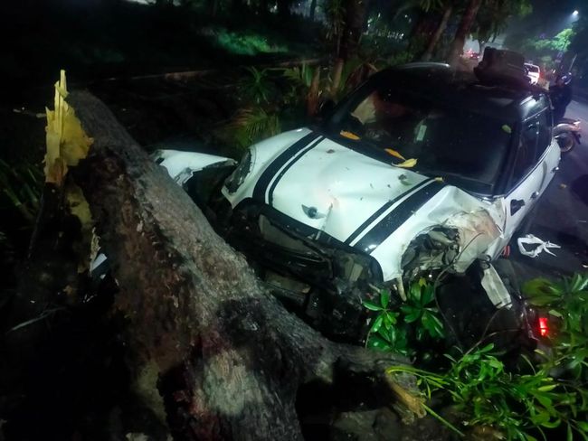 Selain itu, sebuah pohon di median jalan Ahmad Yani juga roboh gegara ditabrak mahasiswi tersebut. Sementara sisi kanan depan dan kiri mobil buatan Eropa itu ringsek.