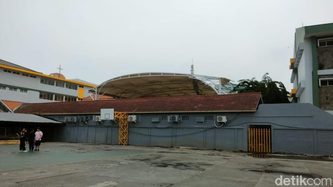 Pantauan di SMP Kristen Petra 3, terpantau bahwa atap berbahan terpal yang menaungi sebuah lapangan basket terlihat menganga pada sisi barat.