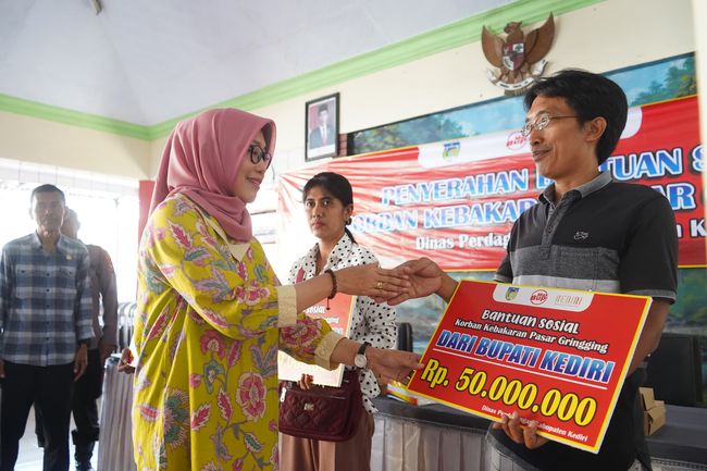 Sementara itu, melalui Kepala Dinas Perdagangan Kabupaten Kediri Tutik Purwaningsih menjelaskan bantuan yang diberikan sebesar Rp 50 juta untuk 3 pedagang yang menjadi korban kebakaran. Adapun setiap pedagang mendapatkan masing-masing Rp 50 juta.