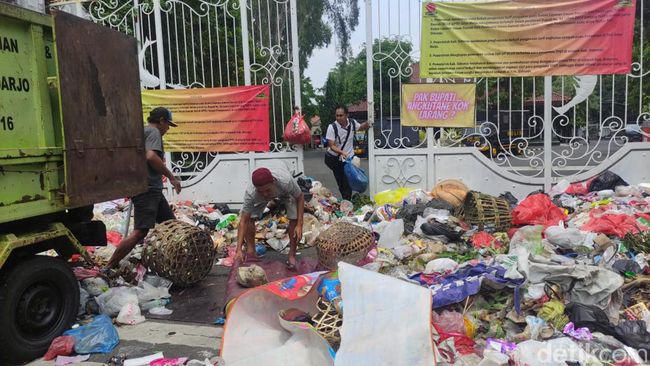 Ratusan petugas kebersihan menggelar demonstrasi di depan pendopo Kabupaten Sidoarjo. Mereka membuang sampah hingga menutupi akses masuk ke pendopo.