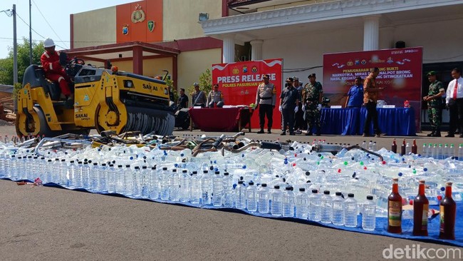 5.400 Botol miras berbagai merk dan knalpot brong dimusnahkan. Botol miras dimusnahkan dengan cara dilindas alat berat. Sementara knalpot brong digergaji lalu dihancurkan bersama botol-botol miras.