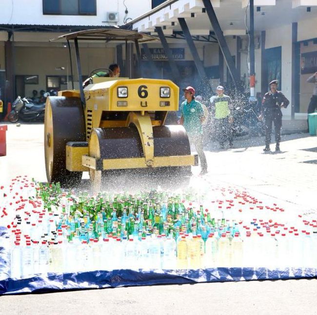 Sedikitnya 2.218 botol miras digilas dengan alat berat. Terdiri dari 1.473 botol arak, 538 botol bir, dan 207 botol anggur putih. Ribuan botol miras ini disita karena akan dijual secara ilegal di Jombang untuk perayaan Nataru.