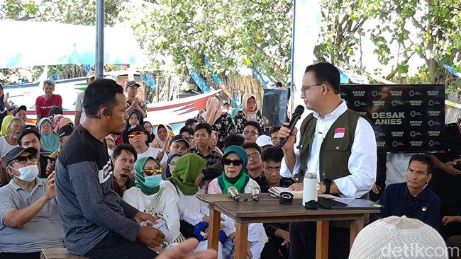 Puluhan nelayan di Kampung Nelayan Blimbingsari Banyuwangi hadir dalam acara Desak Anies. Mereka bertatap muka langsung dengan capres nomor urut 01 Anies Baswedan. Kesempatan itu dimanfaatkan nelayan untuk sambat atas kesulitan solar yang kerap dialami hingga terkait perizinan yang sulit.