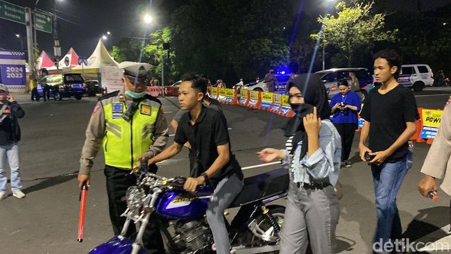 Pantauan detikJatim di lokasi setidaknya hingga pukul 21.00 WIB, ada puluhan muda-mudi yang sudah disetop dan diputar balik lantaran mereka menggunakan kendaraan dengan knalpot brong, tidak memakai helm, bahkan tidak membawa STNK maupun identitas.