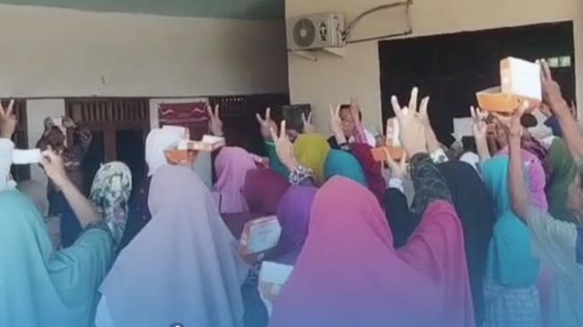 Kemudian, ada seseorang yang memberi instruksi kepada warga melalui mikrofon agar membuka nasi kotak itu sambil mengangkatnya untuk difoto.