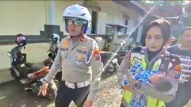 Bayi itu lantas dinaikkan mobil patroli Sat Lantas yang kebetulan terparkir di tepi jalan, lantas segera mengevakuasi ke RS Bhayangkara untuk segera mendapat penanganan intensif.