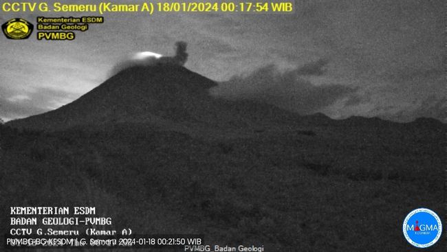 Gunung Semeru kembali mengalami erupsi. Kali ini tinggi letusan kurang lebih 700 meter dari puncak. Erupsi terjadi pukul 00.16 WIB, Kamis (18/1/2024).